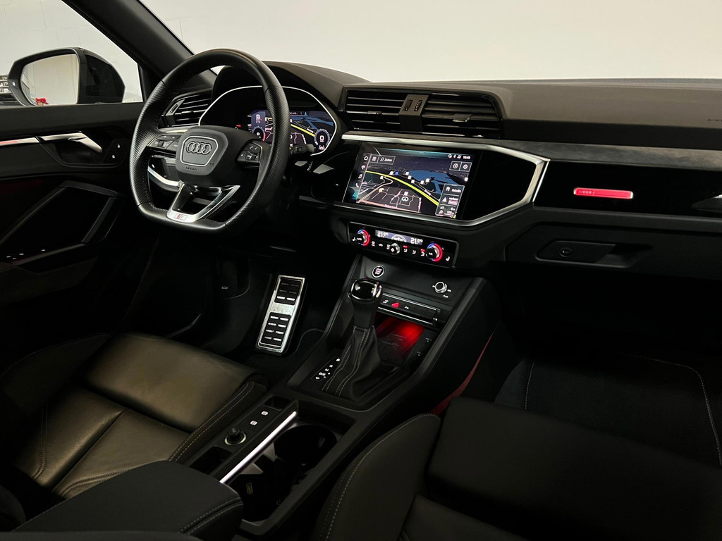 Deze auto nodigt u uit om plaats te nemen achter het sportstuur en onmiddellijk de weg op te gaan. De liefhebbers hebben het al gezien: de sportieve, stoere S-Line styling! Een krachtige motor geeft deze auto zijn sportieve prestaties. En o ja, het lederen interieur is ook een vermelding waard! Deze Audi Q3 Sportback heeft verwarmbare voorstoelen, voor zowel bestuurder als bijrijder. Chauffeur en bijrijder zitten stabiel in de scherpe bochten door de sportstoelen. Dat noemen ze nou een ruimtelijk effect: het elektrisch bediende glazen panoramadak. De bagageruimte is toegankelijk via een comfortverhogende elektrische achterklep. De koplampen met matrix LED-verlichting geven daglichtkwaliteit zonder tegenliggers te hinderen. Bij de uitrusting van deze auto horen onder meer 20 inch lichtmetalen velgen, warmtewerend glas, in delen neerklapbare achterbank, LED-achterlichten en variabele stuurbekrachtiging.