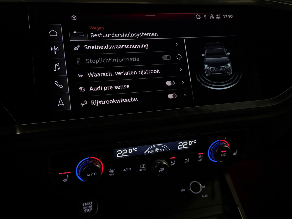 De Audi Q3 Sportback is ook voorzien van ADAS. Deze Advanced Driver Assistence Systems fungeren als extra ogen en oren: ze houden voor u de weg in de gaten en grijpen in wanneer dat nodig is. Onderweg fungeert de verkeersbord-detectie als het ware als uw bijrijder en attendeert u op de verkeersborden langs de weg. Het Lane-keeping systeem zorgt voor een automatisch constante positie binnen de rijstrook. Afdwalen is uitgesloten. De forward collision warning geeft een botswaarschuwing als een aanrijding dreigt met een voorligger. In deze Audi vinden we verder een dodehoekdetectie, accident avoidance system, hill hold functie, frontale botsbescherming en bandenspanningcontrolesysteem.