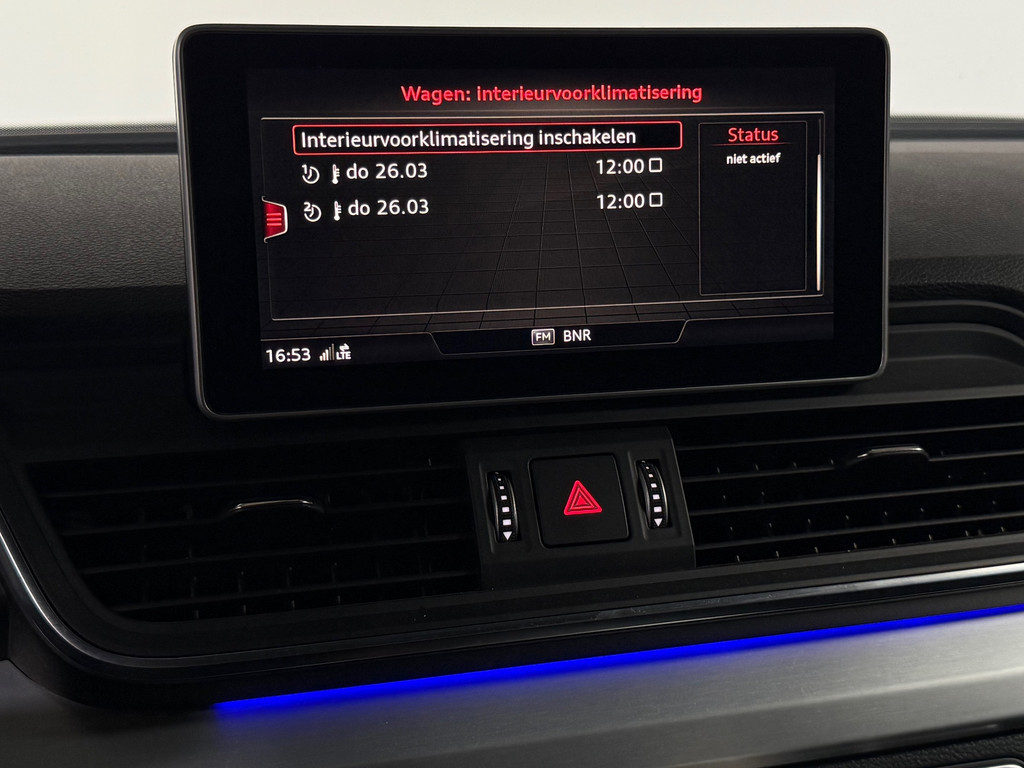 U rijdt gemakkelijk, comfortabel en zonder zorgen met deze Audi Q5. Het sportieve uiterlijk is meegeleverd in de vorm van de S-Line styling. Een viercilinder motor en een automatische transmissie zorgen voor de uitstekende prestaties van deze auto. Basisuitvoering? Niks daarvan! Deze komt met lederen interieur, een elektrisch bediende glazen panorama dak en een elektrisch bedienbare achterklep. De sportstoelen geven het interieur een super strakke look. De slimme koplampen gebruiken de allernieuwste matrix LED-verlichting. Altijd maximaal zicht, nooit verblinding bij de tegenligger. Bij de uitrusting van deze Audi horen onder meer 21 inch lichtmetalen velgen, warmtewerend glas, in delen neerklapbare achterbank, LED-achterlichten, verstelbare lendensteunen en verwarmde ruitensproeiers.