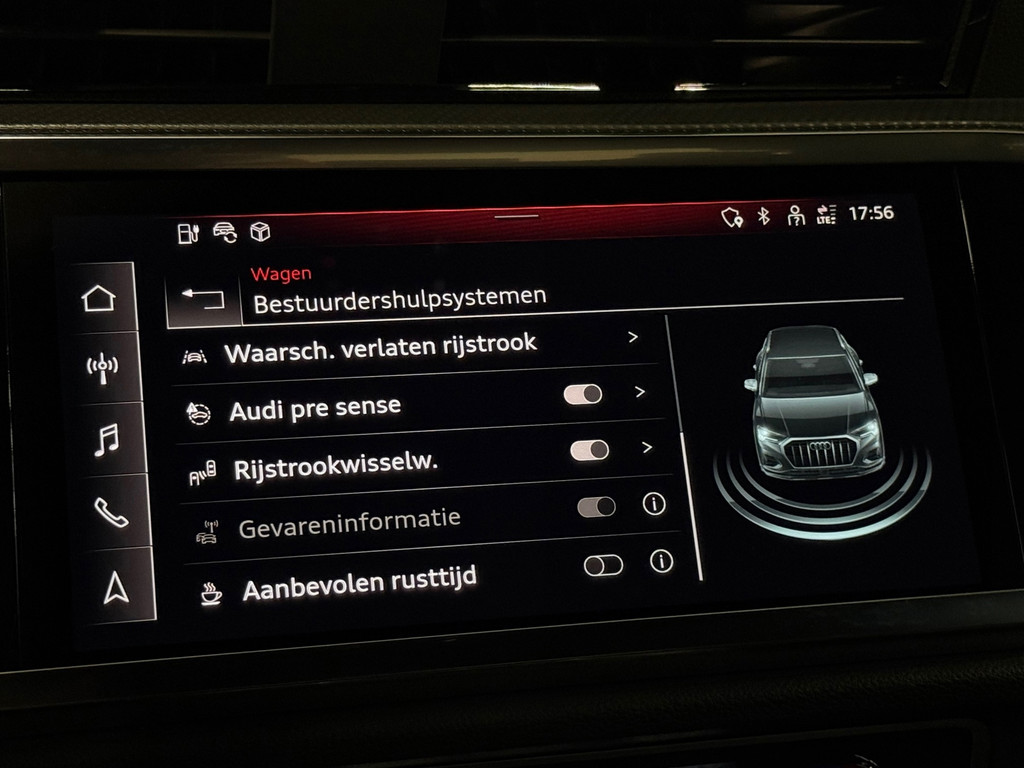 Het rijden met deze Audi wordt nog meer ontspannen dankzij de innovatieve technieken die onderweg over uw veiligheid waken. In het instrumentarium laat de verkeersborddetectie de actuele verkeersborden zien. Met het Lane-keeping systeem gaat u nooit onbedoeld over de streep. Voor meer veiligheid detecteert deze auto het risico van een aanrijding tijdig via de forward collision warning. Verder is deze auto uitgerust met dodehoekdetectie, accident avoidance system, hill hold functie, frontale botsbescherming en bandenspanningcontrolesysteem.