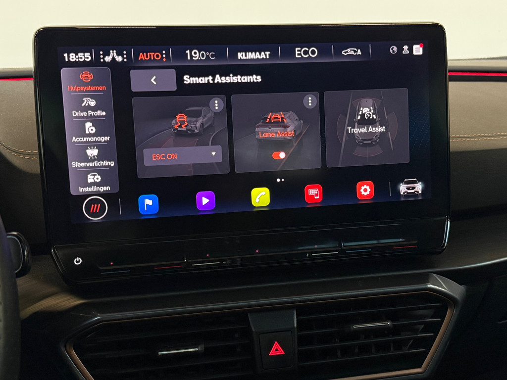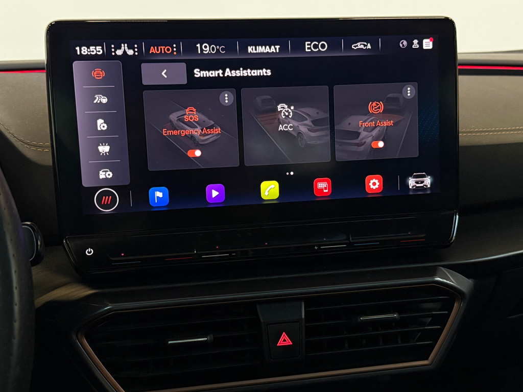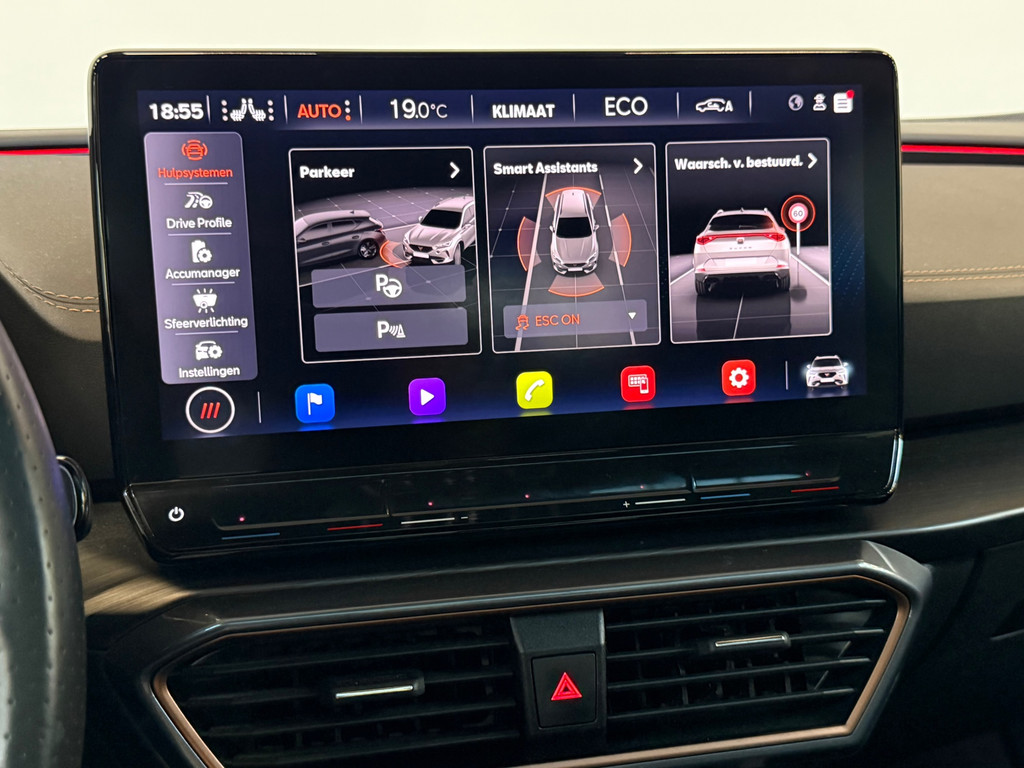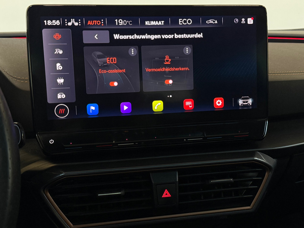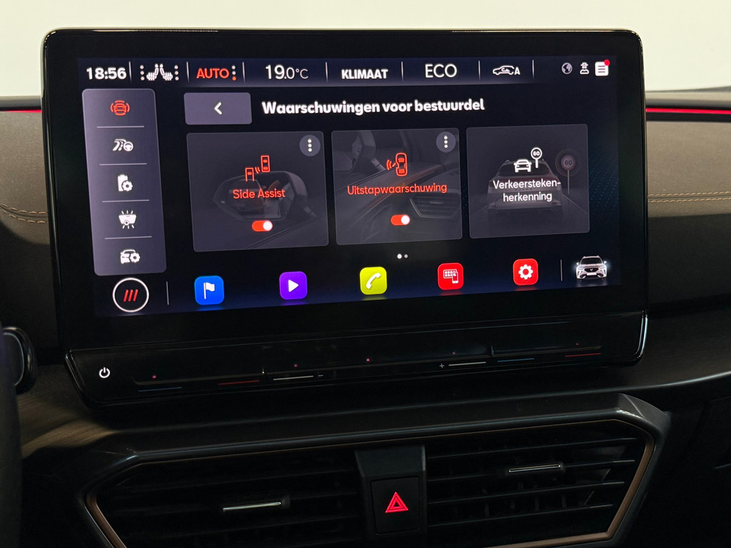 Het rijden met deze Cupra wordt nog meer ontspannen dankzij de innovatieve technieken die onderweg over uw veiligheid waken. Bij de veiligheidssystemen van deze Cupra hoort ook de verkeersbord-detectie. Die leest tijdens het rijden als het ware met u mee en attendeert u op de significante verkeersborden langs en boven de weg. Indien u onbedoeld de rijstrook lijkt te verlaten, reageert het Lane-keeping systeem meteen en corrigeert. Voor meer veiligheid detecteert deze auto het risico van een aanrijding tijdig via de forward collision warning. De veiligheid van deze auto wordt verder verhoogd door dodehoekdetectie, accident avoidance system, hill hold functie, vermoeidheidsherkenning en bandenspanningcontrolesysteem.